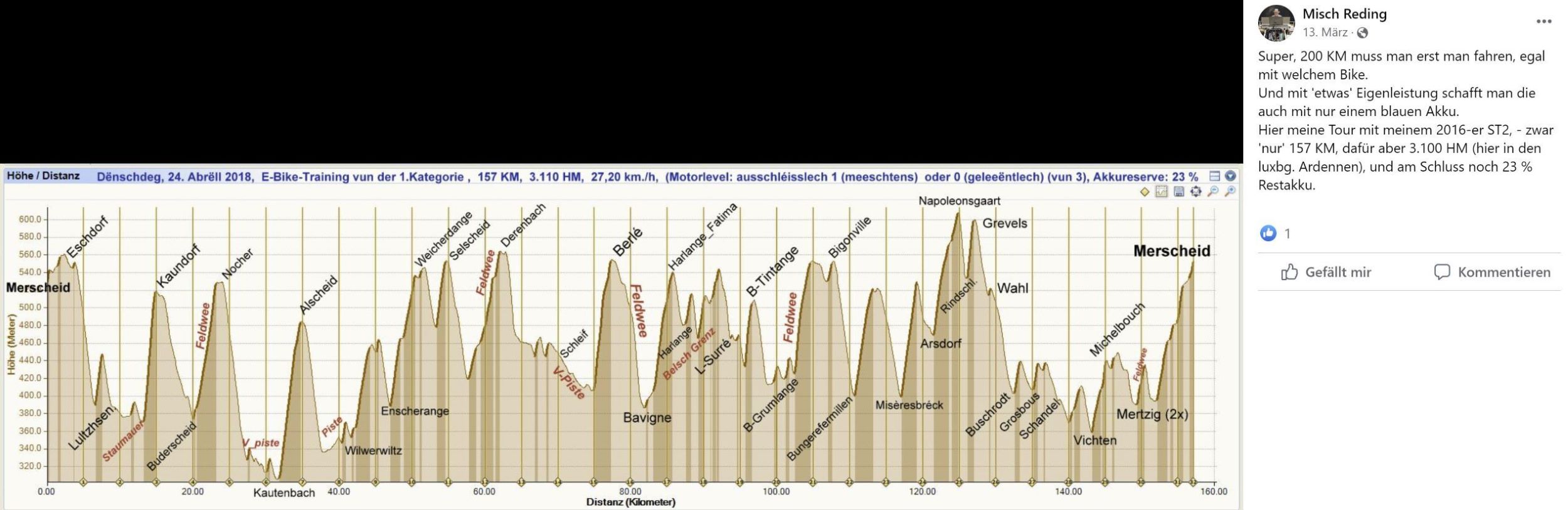 Minimale Reichweite - florian1984 - 14.07.2022 Werksangabe bei ebike um 50% teilen und du bekommst halbwegs realistische Werte (zumindest bei mir :-)). Die Reichweite hängt mit soviel Faktoren zusammen daher sollte Stromer wie auch andere Hersteller es bereits machen einen Kalkulator anbieten. Ein Reifen wie bsp. https://www.schwalbe.com/blog/neuigkeiten/innovationen/unplattbar/ wär mir auch viel Lieber. Sattel und Standartfederung gehören für mich bei dieser Preislage mit dabei. RE: Premiere: Goldener Stromer ST2022 wird zum Solid Gold ST7 - bluecat - 14.07.2022 (14.07.2022, 08:01)florian1984 schrieb: ... sollte Stromer wie auch andere Hersteller es bereits machen einen Kalkulator anbieten. Und welche Annahmen bezüglich den unten erwähnten Faktoren sollen für den Kalkulator Deiner Meinung nach getroffen werden? RE: Premiere: Goldener Stromer ST2022 wird zum Solid Gold ST7 - Hannes Buskovic - 14.07.2022 (14.07.2022, 08:01)florian1984 schrieb: Werksangabe bei ebike um 50% teilen und du bekommst halbwegs realistische Werte (zumindest bei mir :-)). Die Reichweite hängt mit soviel Faktoren zusammen daher sollte Stromer wie auch andere Hersteller es bereits machen einen Kalkulator anbieten. Ein Reifen wie bsp. https://www.schwalbe.com/blog/neuigkeiten/innovationen/unplattbar/ wär mir auch viel Lieber. Sattel und Standartfederung gehören für mich bei dieser Preislage mit dabei. "60 km - xxx" beim blauen Akku finde ich eine realistische Angabe im Neuzustand. RE: Premiere: Goldener Stromer ST2022 wird zum Solid Gold ST7 - SCH - 14.07.2022 Den Rechner sollten ja hier alle kennen? https://www.bosch-ebike.com/ch/service/reichweiten-assistent Finde ich schon ein sehr gutes Tool. RE: Premiere: Goldener Stromer ST2022 wird zum Solid Gold ST7 - Martini Snowfox - 14.07.2022 Ich habe mir eine eigene Google-Tabelle gebastelt, welche ich nach jedem Ladezyclus mit Daten fülle wie gefahrene km, Füllstand zu Beginn (nach dem laden) und zu Ende (vor dem Laden) + Fahrzeit. Daraus erreichnet sich dann die Geschwindigkeit, der Verbrauch, etc. Diese Daten werden in 4 Kategorieen aufgeteilt, welche sich aus dem maximalen Verbrauch und dem minimalen Verbrauch ergeben und erreichnet mir 4 Verbrauchsstufen, welche ich auf einem Laderechner direkt abrufen kann. So kann ich beispielsweise meine Zielreichweite eingeben und es rechnet mir, wie viel Akku ich dafür bei welcher Wahrweise benötige. Da dies lernfähig ist, wird es genauer umso mehr ich fahre. Und so in etwa kommt es auch hin. Auch kann ich hier rechnen lassen wie lange ich laden muss um von Füllstand X (z.B. 25%) auf Y (z.B. 82%) zu kommen. Bei gelegenheit mach ich mal nen Thread dafür auf und verlinke es. RE: Premiere: Goldener Stromer ST2022 wird zum Solid Gold ST7 - raser6 - 14.07.2022 (14.07.2022, 09:20)Hannes Buskovic schrieb:(14.07.2022, 08:01)florian1984 schrieb: Werksangabe bei ebike um 50% teilen und du bekommst halbwegs realistische Werte (zumindest bei mir :-)). Die Reichweite hängt mit soviel Faktoren zusammen daher sollte Stromer wie auch andere Hersteller es bereits machen einen Kalkulator anbieten. Ein Reifen wie bsp. https://www.schwalbe.com/blog/neuigkeiten/innovationen/unplattbar/ wär mir auch viel Lieber. Sattel und Standartfederung gehören für mich bei dieser Preislage mit dabei. Aber was bitte sind 60 km bei einem e bike . Zumal du sagst es neu Zustand das hält ja nicht lange an . Mein Akku hat in 6 Monaten schon 5 % gesamt Kapazität verloren, finde sowas einfach nur traurig und nicht sehr qualitativ. ist alles noch genauso Schrott unausgereift wie bei den e Autos die schaffen das auch nicht . Mit meinem Rennrad fahre ich 100 km ohne das ich Probleme bekomme. Und bei e bike hängst da nach 60 km und darfst erstmal 3 std Minimum da sitzen um zu laden . Ein Schnellladegerät wäre optimal welches man an allen Stromer nutzen könnte . RE: Premiere: Goldener Stromer ST2022 wird zum Solid Gold ST7 - florian1984 - 14.07.2022 (14.07.2022, 14:26)raser6 schrieb: Mein Akku hat in 6 Monaten schon 5 % gesamt Kapazität verloren, finde sowas einfach nur traurig und nicht sehr qualitativ. Das finde ich schon bisschen Krass. Verwende meinen blauen Akku seit rund 3 Jahren und habe gefühlt etwa 10% von der ursprünglichen Reichweite eingebüsst. Verwende aber das eBike meistens nur zur Arbeit etwa und da bin ich immer in den Optimalen werten (32km) komme etwa mit 40-50% auf Stufe3 zuhause an und lade es gleich wieder. Bike 100% in Garage. Und auch in Büro in beheizten Raum. Früher rund 2-3 mal die Woche und heute dank HomeOffice noch etwa 1-2 mal die Woche ^^. RE: Premiere: Goldener Stromer ST2022 wird zum Solid Gold ST7 - ST2-jsg - 14.07.2022 (14.07.2022, 14:39)florian1984 schrieb:(14.07.2022, 14:26)raser6 schrieb: Mein Akku hat in 6 Monaten schon 5 % gesamt Kapazität verloren, finde sowas einfach nur traurig und nicht sehr qualitativ. Angaben zum SoH sind ohne Angaben der gefahrenen Gesamtreichweite wertlos. Weiter stecken im Begriff "Reichweite" jede Menge von Variablen die wiederum eine konkrete Angabe zur Reichweite/Akkuladung quasi verunmöglichen. Stromer spricht beim neuen ST7 (und auch allen anderen Modellen) immer von "Reichweite bis..." Aktuell beim ST7 z.B. von 260 km. Dass dies Maximalwerte sind sollte eigentlich allen klar sein. Das Problem kennen wir ja auch aus der Automobilität wo der Benzinverbrauch/100 km Jahrzehnte geschönt war und immer noch ist. Mit den E-Autos und den Akkureichweiten ist das übrigens nicht anders. Auch nicht mit dem aktuellen WLTP Messverfahren. Stromer bewegt sich hier also keineswegs weit ab von der gängigen Praxis, weiss das aber auch zu relativieren - wie im Video hier von Tomi Viiala (Stromerbike VP Sales Global) bez. 'All In Reichweite' des ST7 zu hören ist. Ich fahre einen ST3 und habe mal ca. 1 Jahr Statistik über meine Fahrten geführt. Mein BQ983 (neu) erreichte dabei bei 'All In' etwa 60 km Maximalreichweite. Ich wiege allerdings fast 100 kg. Ein leichterer Fahre dürfte da