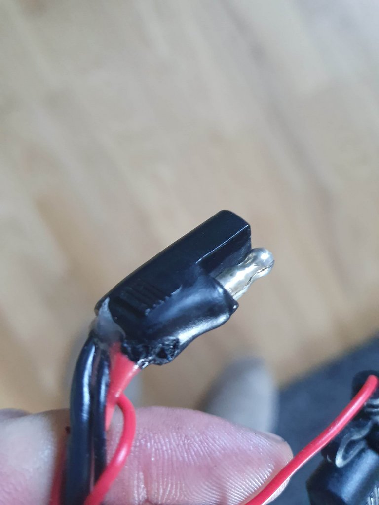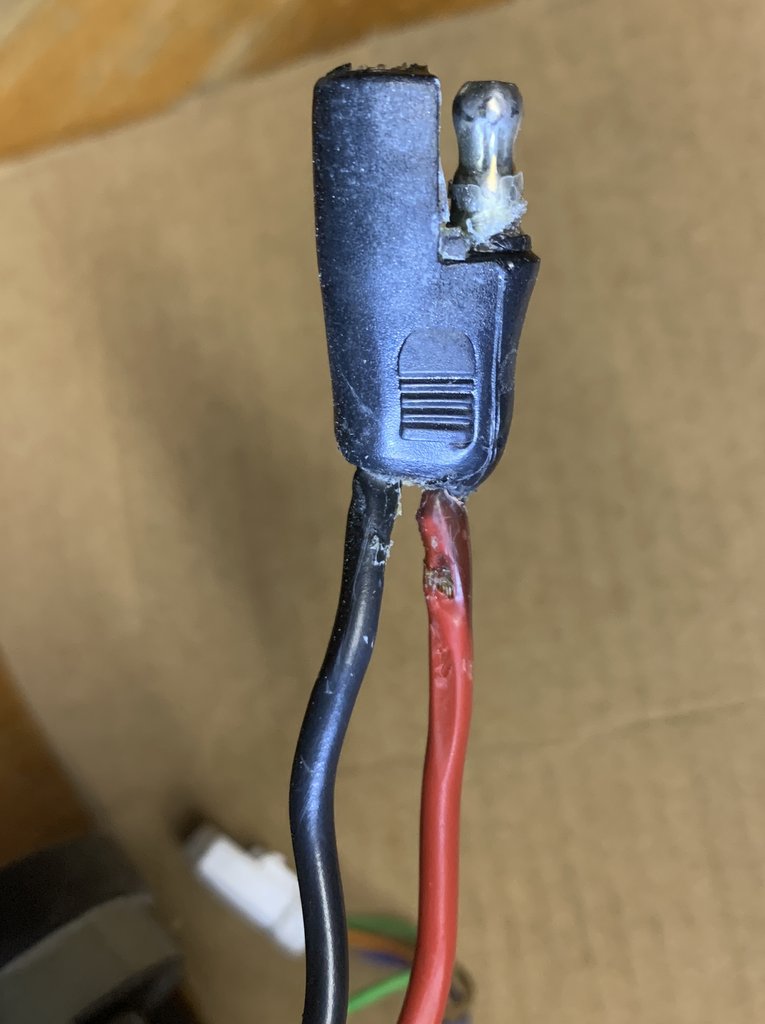 Die Dimensionierung und Wahl der Kabel bzw. Steckverbindung zum Controller hin, das Wicket cable, war bei den Bikes vor 2020 meiner Meinung nach zu schwach. Der verwendete SAE Stecker und Kabelquerschnitt scheint vor allem auf lange Sicht der Strombelastung nicht gewachsen zu sein. Als ich meinen Extenderakku anbaute sah meine SAE Verbindung (bei 21'500 km) so aus. Es war nur noch eine Frage der Zeit bis hier das Problem akut geworden wäre.