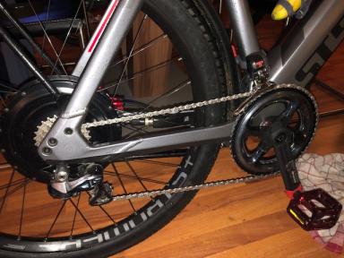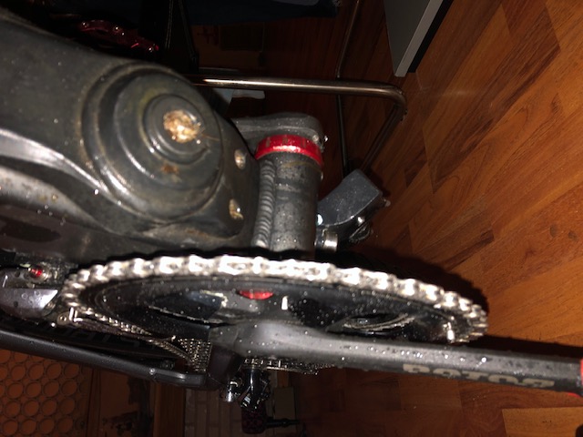 Mittlerweile habe ich auch endlich mein Lieblingssxhmiermittel für die Kette gefunden. Nämlich gar keines. Habe meine ketten mehrfach in Waschbenzin eingelegt bis sie komplett fettfrei sind. In einem Topf habe ich Kerzenwachs mit Mos2 Pulver und PFTE Pulver geschmolzen, die Kette im heißen Wachs gebadet, erstarren lassen, gängig gemacht und dann eingebaut. Übers kettenwachsen gibts derzeit zig YouTube Videos. Meinungen und Geister scheiden sich zu dem Thema. Fakt ist man muss Lust dazu haben, da es zum normalen Ölen viel mehr Aufwand ist. Aber es lohnt sich. Ich zeig gleich in nen Bild den Antrieb den ich vor rund 400km zuletzt gereinigt habe. Gefahren habe ich diese jedoch mit 3 verschiedenen Ketten die ich alle zuvor mit Wachs behandelt habe. Aktuelle Kette ist nun 5 Tage und 90km drauf.
