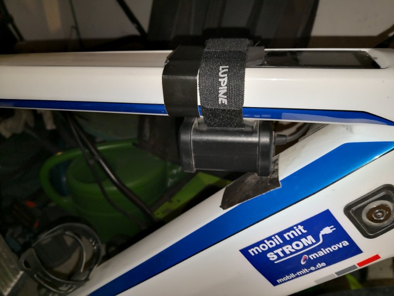 Hinter dem Akku oben auf dem Oberrrohr etwas dicker Schaumstoff, dass der Akku nicht nach hinten rutschen kann und vorne oben innen am Unterrohr etwas Tape, falls der AKku nach vorne rutscht/öfter gegen das Unterrohr stößt. Kann man sich vermutlich beides schenken, das Lupineklettband ist sehr rutschfest.