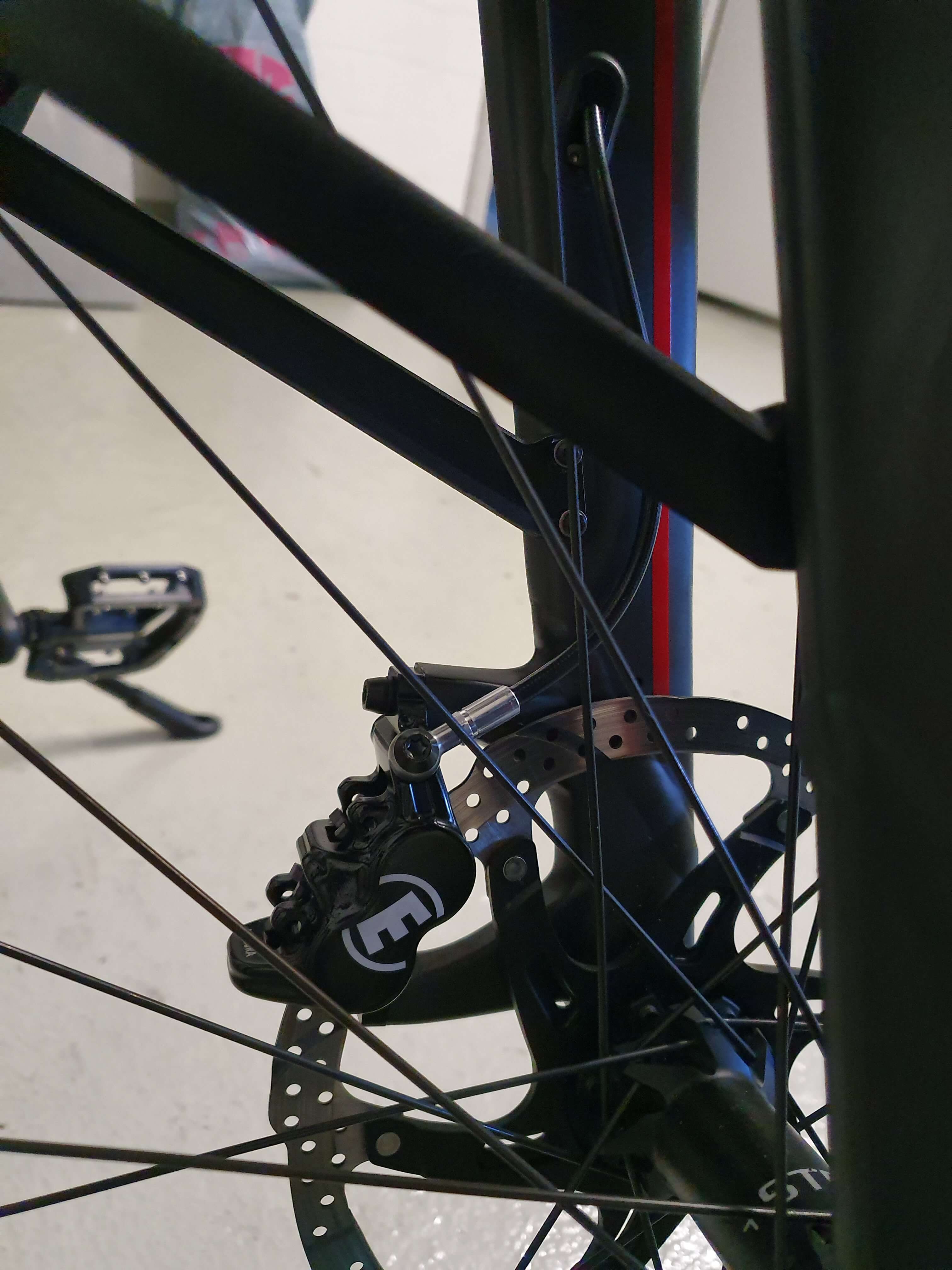 Die bremsleitung geht vom Lenker durch den Vorbau, am Unterrohr im Rahmen entlang , und kommt etwa 15cm vor dem Sattel aus der Kettenstrebe heraus.