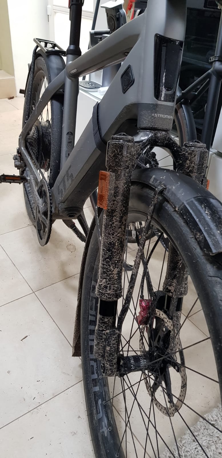 Die Bilder illustrieren den Stand nach 80 KM über nasse Straßen, durch Pfützen, ein paar unbefestigte Wege.