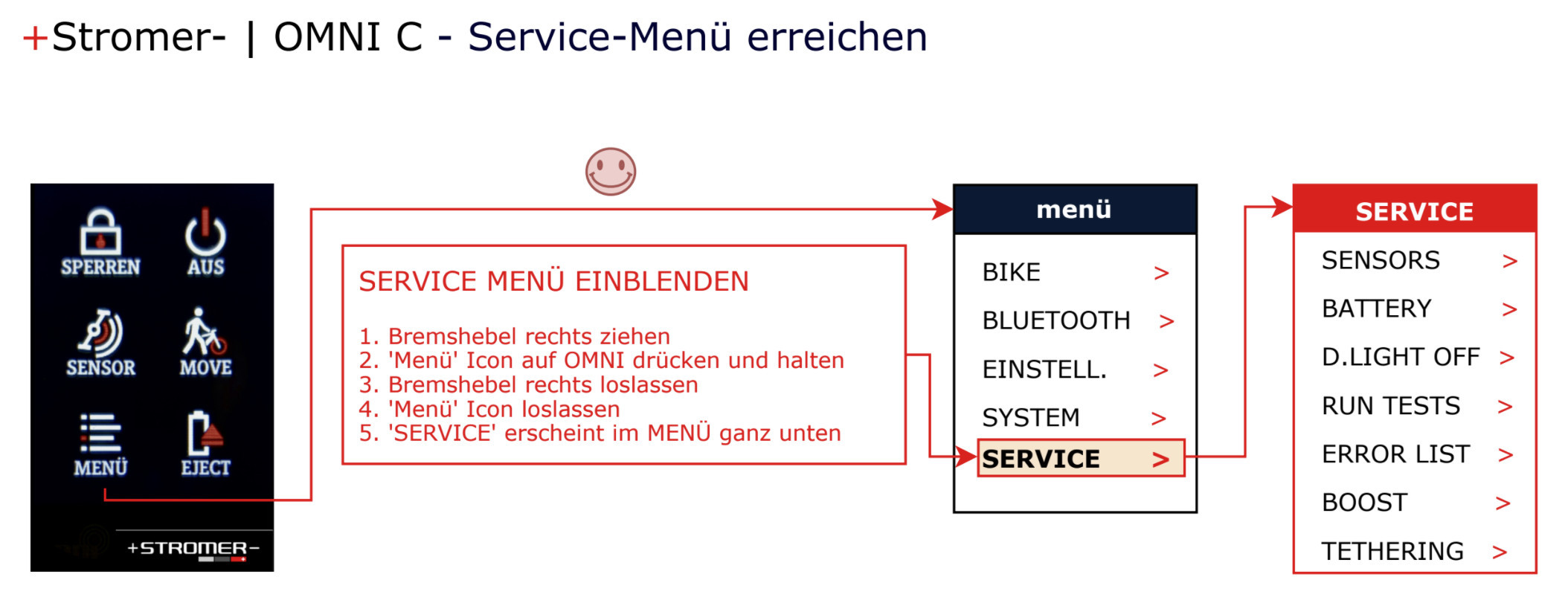 Wenn man statt der rechten Bremse, nur das MENU Icon für mehr als 10 sek. drückt und loslässt erscheint auch ein Service Eintrag aber