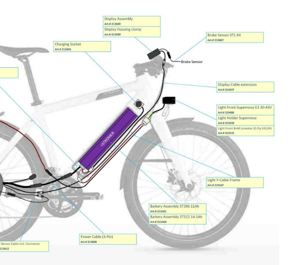 Der ST1 Akku hat ja 36V Nennspannung, d.h. je nach Ladezustand kommen da 31V- 41V raus. Wenn am Lichtausgang wirklich so viel rauskommt, brauchst Du wohl einen Spannungswandler für die Supernova. Nach dem Diagramm von Dir scheint der Scheinwerfer ja direkt am Akku zu hängen. Aber wenn da doch ein Steuergerät dazwischen hängt, wüsste ich nicht ob das die 18W von der Supernova erträgt. Wenn ich ganz sicher gehen wollte, würde ich auch am Hauptstrang abgreifen und einen Spannungswandler dazwischenhängen.