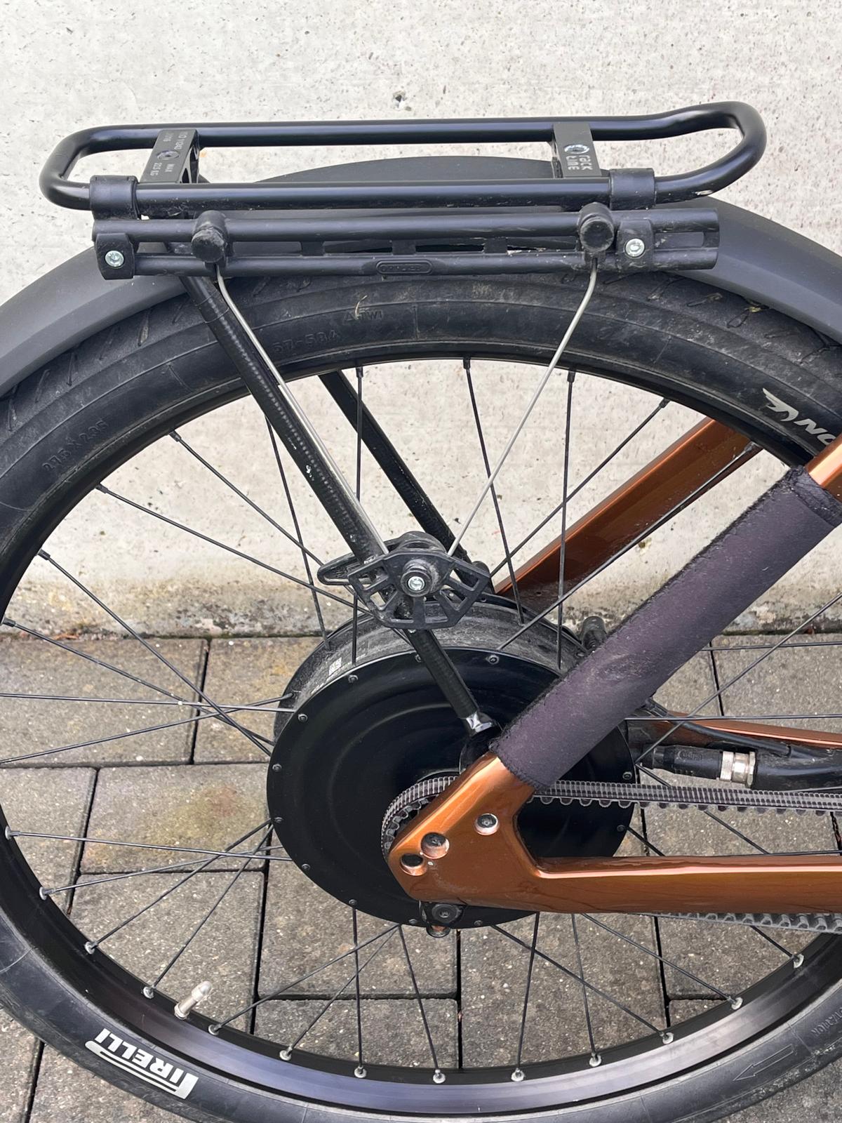 die Gepäckträger sind an allen Stromern gleich und funktionieren nur mit dem Snap it 1.0 Adapter. Wie du sicherlich schon bemerkt hast, hat der Gepäckträger keine abgesetzten Stangen, um Taschen aufzuhängen, was eine gleichzeitige Benutzung eines Korbs o.ä. mit dem Adapter UND 2 Taschen schwierig, aber nicht unmöglich macht. Leider kann man die Halterungen der allermeisten Taschen nicht weit genug auseinander schieben, um sie links und rechts neben dem Adapter auf den Gepäckträger zu klemmen.