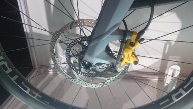 Das Neue ST5 kommt standardmässig mit integrierten ABS für das Vorderrad. Die ABS Steuerung sitzt im Oberrohr, hinter dem Omni. Sichtbar ist damit nur der zweite kleine Sensor-Ring innerhalb der Bremsscheibe. Wahrscheinlich werde die ABS Funktion künftig auch auf die anderen Modelle ausgeweitet.