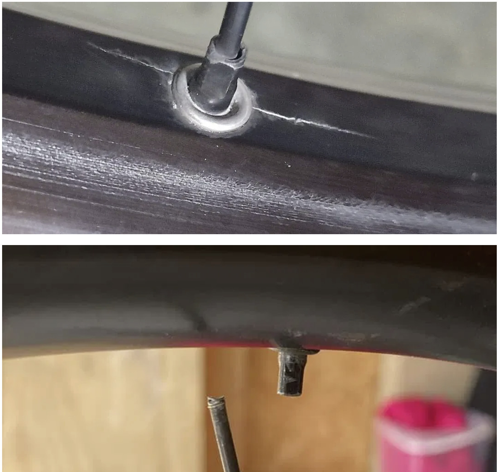 Bei den betroffenen Felgen können sich die Nippel nicht frei bewegen. Das führt bei einigen Speichen dazu, dass die Speiche und der zugehörige Nippel nicht in einer Flucht verlaufen, sondern in einem Winkel (nicht 180°) zueinander "abgeknickt" sind. Am Ende des Nippels (zum Radmittelpunkt) drückt / scheuert die Speiche am Nippelrand. An dieser Stelle brechen die Speichen.