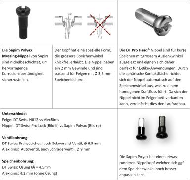 Das Beste ist es dann natürlich eine Felge zu verwenden, bei denen sich die Nippel frei ausrichten können. Das Bruch-Risiko wird auch gesenkt, wenn die Nippel möglichst lang sind und aus einem "weicheren" Material bestehen. Dieses verringert die Knick- und Reibkräfte am Übergang Speiche-Nippel.
